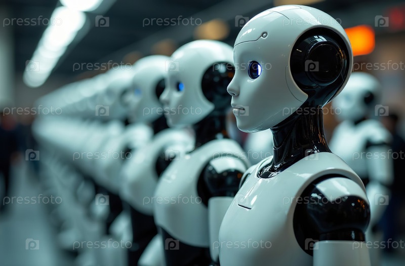Армия человекоподобных киборгов-роботов выстроилась в очередь. Генеративный искусственный интеллект