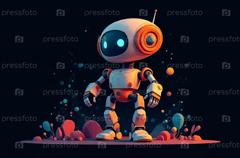 Иллюстрация гуманоидного робота в полный рост на черном фоне. Генеративный искусственный интеллект