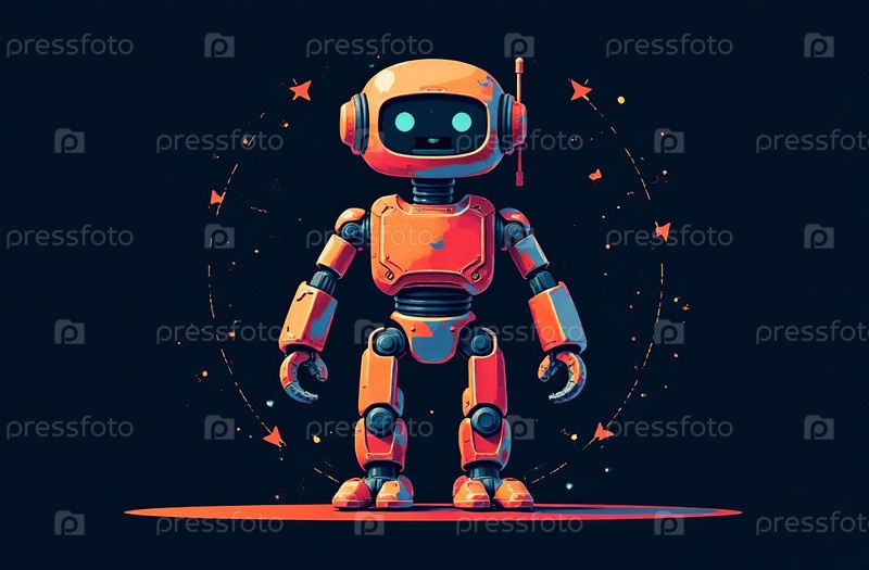 Иллюстрация гуманоидного робота в полный рост на черном фоне. Генеративный искусственный интеллект
