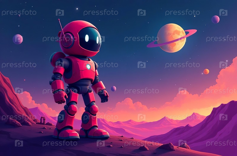 Иллюстрация гуманоидного робота на картинке космической планеты. Генеративный искусственный интеллект