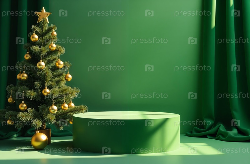 Презентационный стенд для продукта с зеленой драпировкой, рождественский, новогодний. Создано с помощью искусственного интеллекта
