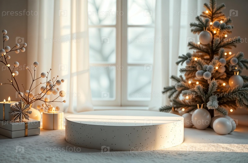 Презентация продукта Подиумное окно Рождественская елка, новогодний стенд. Сгенерировано с помощью ИИ