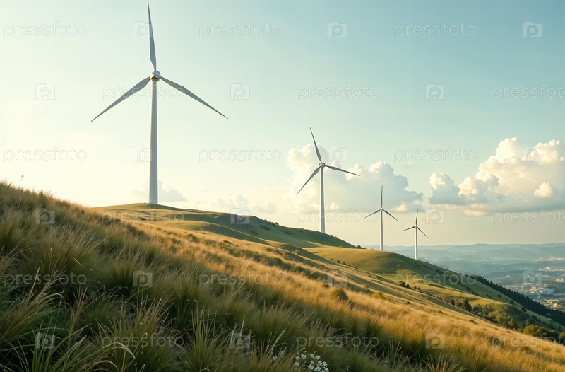 Ветрогенератор на холме, чистая зеленая турбина возобновляемой энергии. Генеративный искусственный интеллект