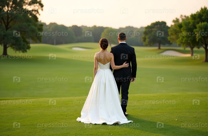 Прогулка жениха и невесты по полю для гольфа, свадебная церемония, вид в полный рост. Генеративный искусственный интеллект