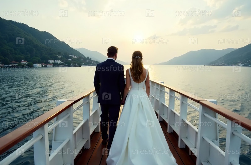 Невеста и жених идут по кораблю, свадебная церемония, вид сзади в полный рост. Генеративный искусственный интеллект