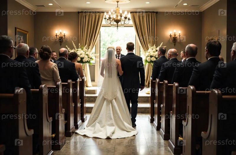 Зал для прогулок жениха и невесты, свадебная церемония, вид сзади в полный рост. Генеративный искусственный интеллект