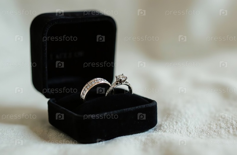 Кольца для помолвки с бриллиантами в черной бархатной коробке на светлом фоне. Генеративный искусственный интеллект