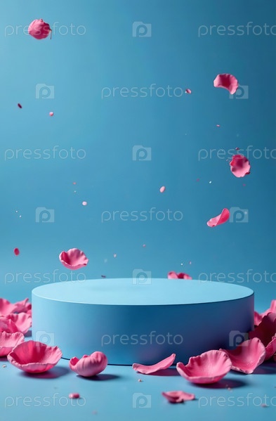 Подиум косметического продукта на синем фоне, свободное место для товаров. Генеративный ИИ