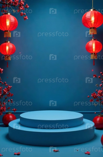 Подиум косметического продукта на синем фоне, свободное место для товаров. Генеративный ИИ