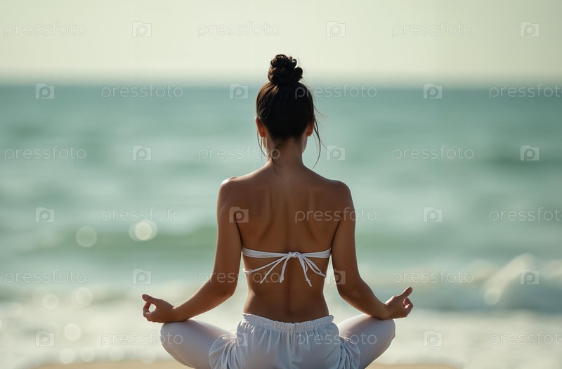 Женщина занимается йогой в парке, йог сидит в позе лотоса на улице. Генеративный искусственный интеллект