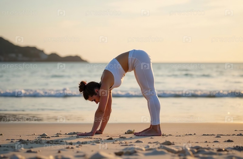 Женщина занимается йогой на песчаном пляже, йог стоит в позе снаружи. Генеративный искусственный интеллект