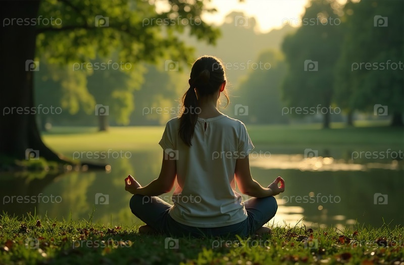 Женщина занимается йогой в парке, йог сидит в позе лотоса на улице. Генеративный искусственный интеллект