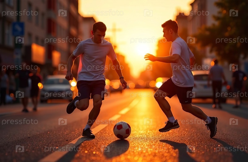 Мужчины играют в футбол на улице, футболисты пинают мяч. Генеративный искусственный интеллект