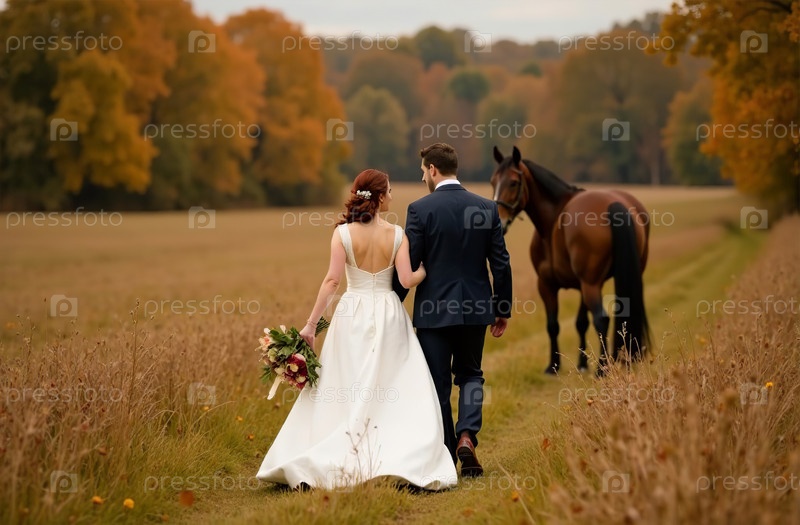 Прогулка жениха и невесты, свадебная церемония, вид сзади в полный рост. Генеративный искусственный интеллект