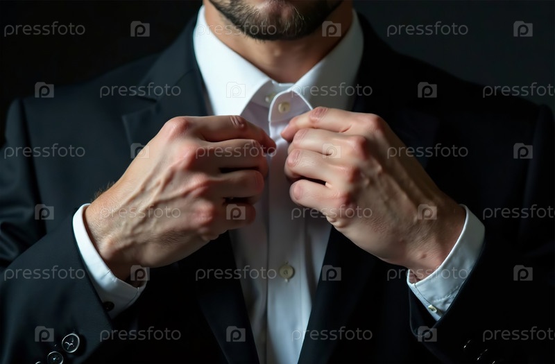 Жених поправляет белую рубашку свадебного костюма, крупный план рук. Генеративный искусственный интеллект