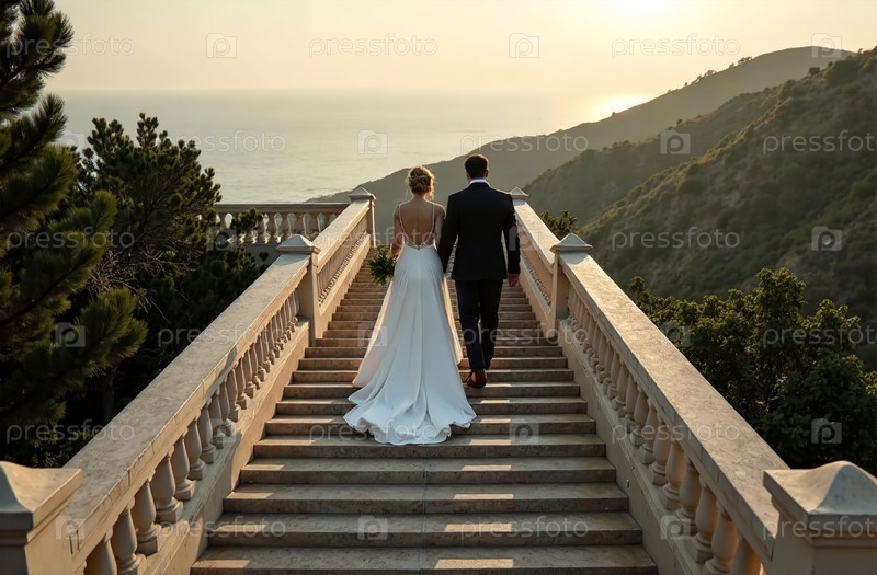 Лестница для жениха и невесты, свадебная церемония, вид сзади в полный рост. Генеративный искусственный интеллект