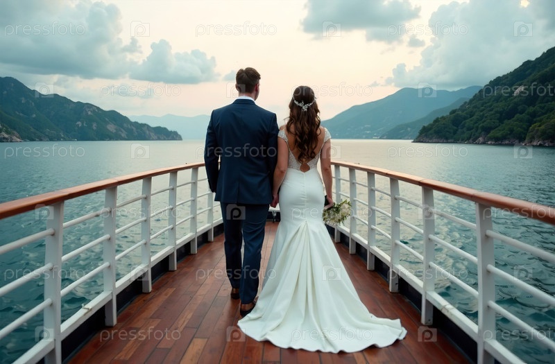 Невеста и жених идут по кораблю, свадебная церемония, вид сзади в полный рост. Генеративный искусственный интеллект