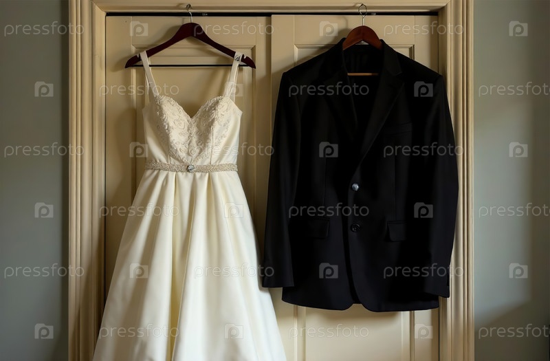 Вешалка для свадебной одежды, спальня, платье невесты и костюм жениха. Генеративный искусственный интеллект