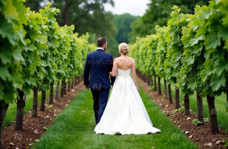 Прогулка жениха и невесты в саду, свадебная церемония, вид сзади в полный рост. Генеративный искусственный интеллект