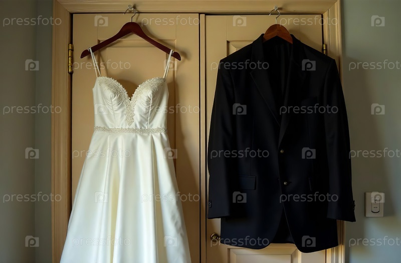 Вешалка для свадебной одежды, спальня, платье невесты и костюм жениха. Генеративный искусственный интеллект