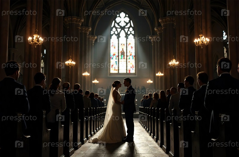 Прогулка жениха и невесты в церкви, церемония бракосочетания, вид сзади в полный рост. Генеративный искусственный интеллект