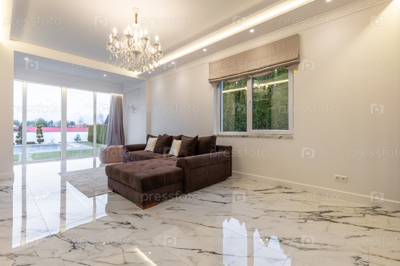 Просторная гостиная с большой люстрой, мраморным полом, мягким коричневым диваном и панорамным видом на сад