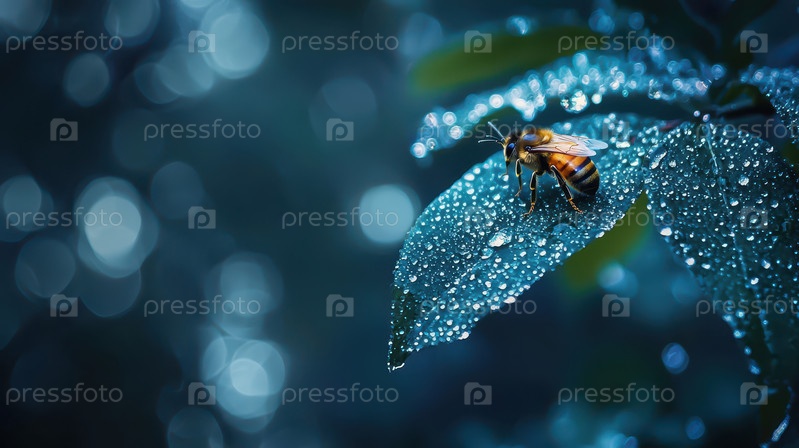 Крупный план пчелы на листе, покрытом росой