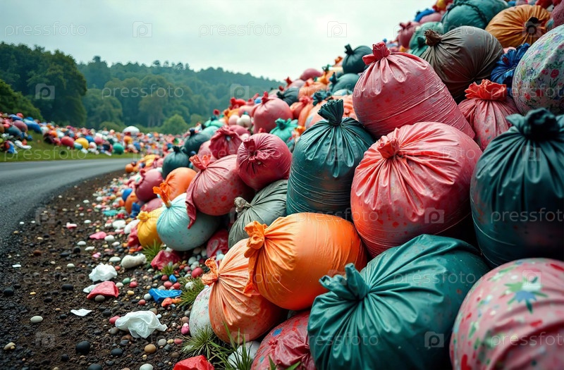 Свалка бытовых отходов, пластиковые пакеты на свалке. Генеративный искусственный интеллект