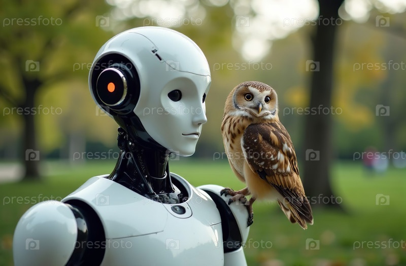 Робот-киборг-гуманоид держит домашнюю птицу сову на плече в парке. Генеративный искусственный интеллект