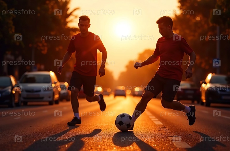 Мужчины играют в футбол на улице, футболисты пинают мяч. Генеративный искусственный интеллект