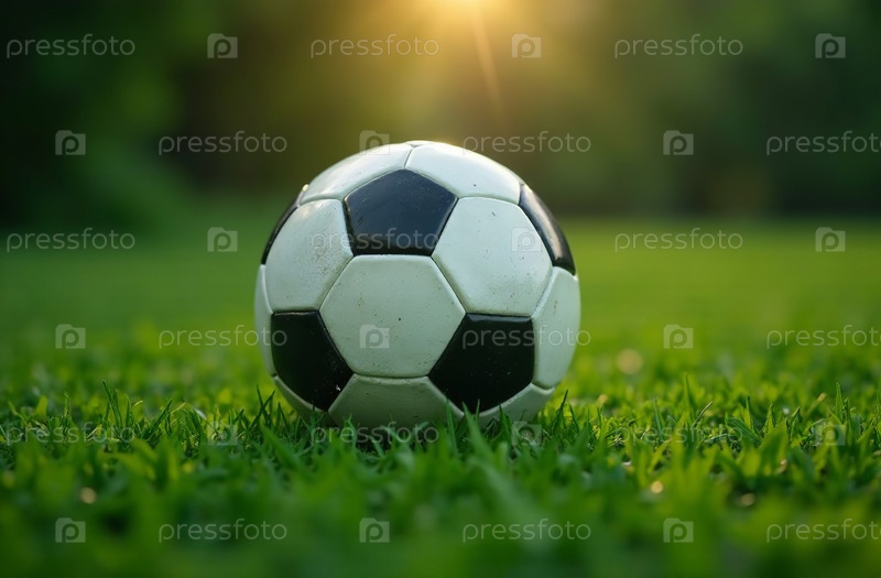 Футбольный мяч лежит на зеленой траве на футбольном поле, крупный план. Генеративный искусственный интеллект