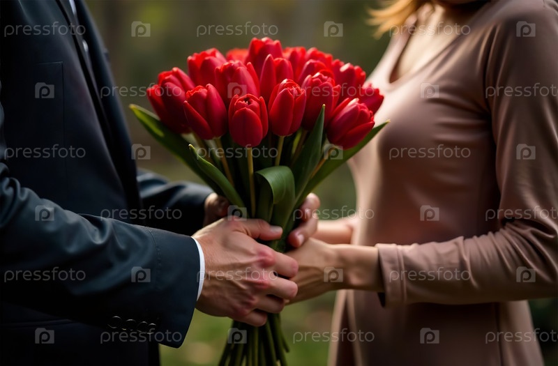 Мужчина дарит женщине букет красных тюльпанов, больших красивых цветов. Генеративный искусственный интеллект