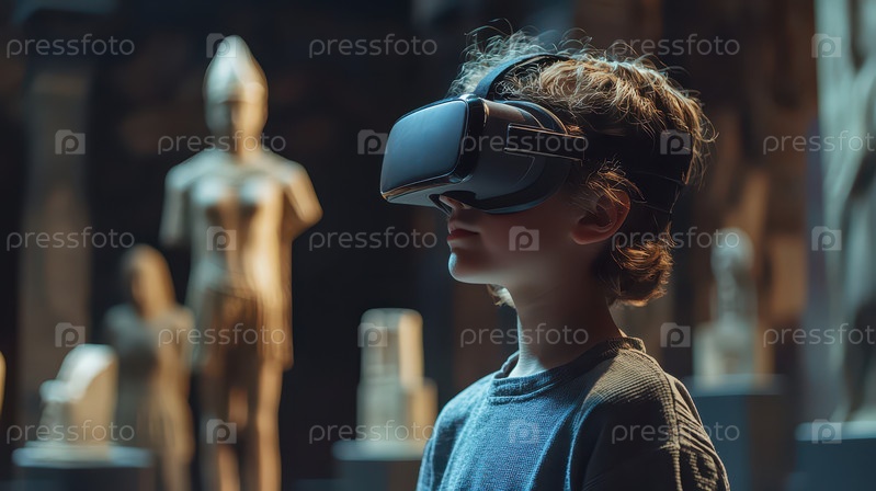 Ребенок в гарнитуре виртуальной реальности в музее со статуями