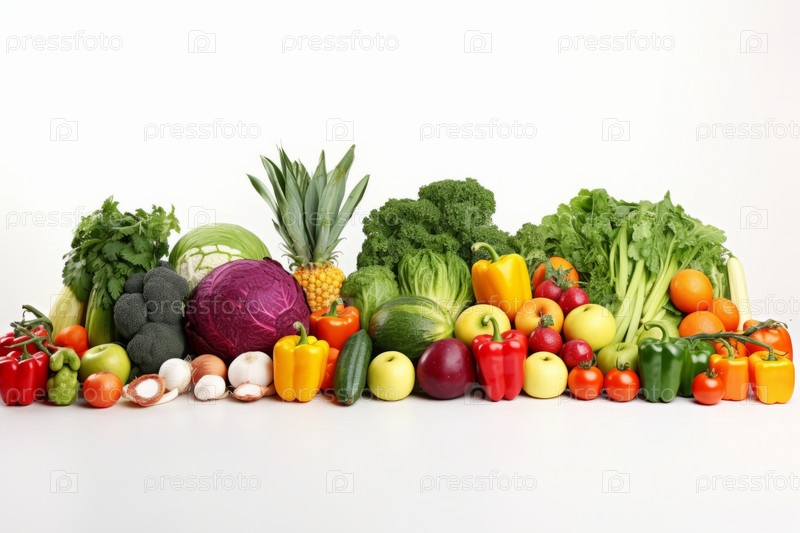 Композиция из фруктов и овощей, изолированных на белом фоне. Красивая широкая рамка со свободным пространством для текста. Коллаж