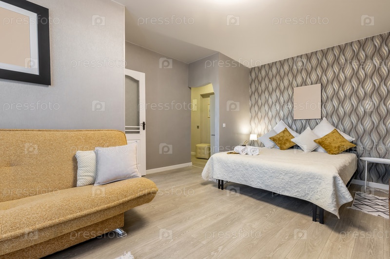 Уютная спальня с желтыми акцентами и диваном