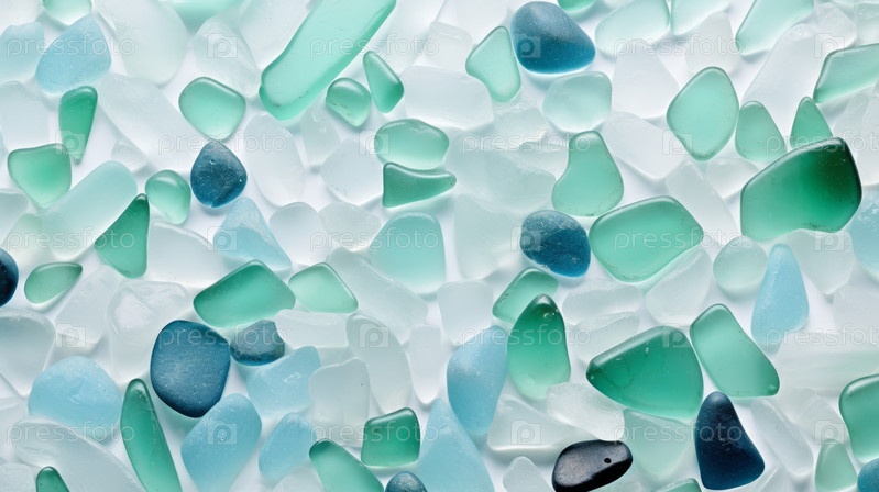 Летний фон из морского стекла сверху. Битое стекло из океана. Морской узор. Океаническая мозаика. Естественные цвета синего, зеленого, белого, найденные на побережье