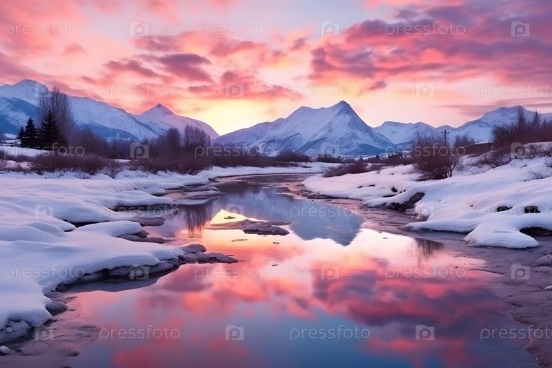 Замерзшее озеро, отражающее заснеженные вершины гор, и яркий розово-оранжевый закат, а также конькобежцы, наслаждающиеся последними мгновениями дневного света