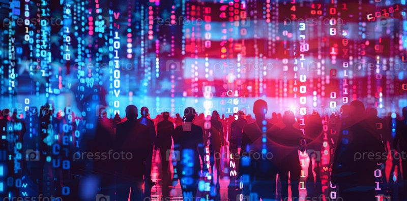 Цифровая эпоха и патриотизм в толпе, стоящей перед киберамериканским флагом