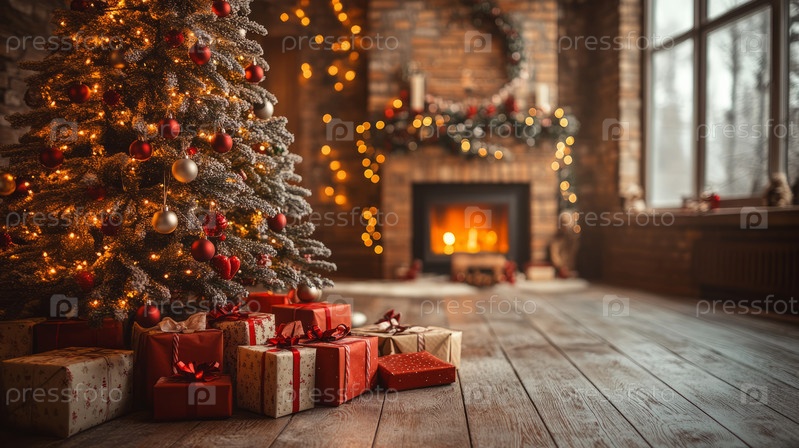 Рождественская сцена с подарками под елкой и уютным камином