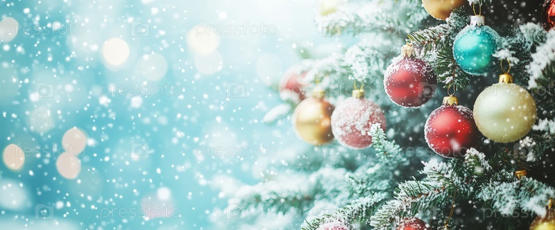 Красиво украшенная рождественская елка с разноцветными игрушками и падающими снежинками создает праздничное и радостное предпраздничное настроение