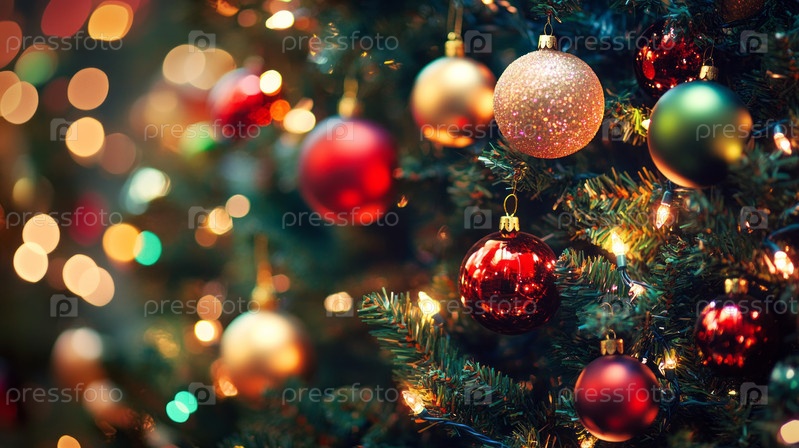 Красиво украшенная рождественская елка с разноцветными игрушками и падающими снежинками создает праздничное и радостное предпраздничное настроение