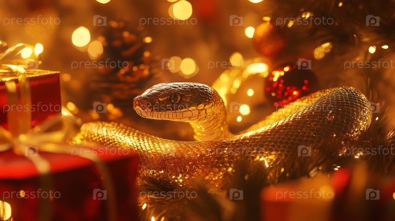 Золотая змея среди сверкающих огней и праздничного декора