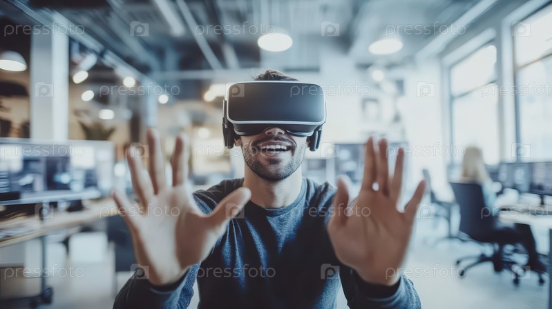 Бизнесмен использует виртуальную реальность в футуристическом офисе
