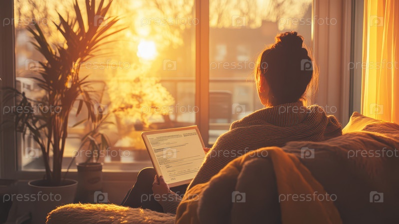 Женщина сидит на уютном диване, укутавшись в теплое одеяло, и читает на планшете, в то время как золотистый солнечный свет наполняет комнату через большие окна, создавая расслабляющую атмосферу