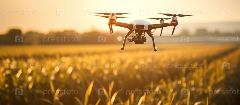 Беспилотный квадрокоптер на зеленом кукурузном поле