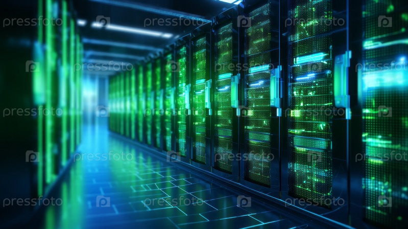 Генеративный коллаж с использованием искусственного интеллекта, изображение, фотография интерьера центра обработки данных с высококачественной защитой серверного хранилища