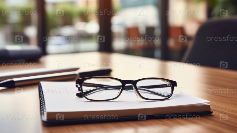 Очки на рабочем месте в офисе возле блокнота