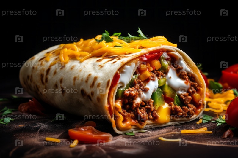 Донер-кебаб на черном фоне. Шаурма с мясом, овощами и соусом, стол с едой, включая курицу, рис и другие блюда