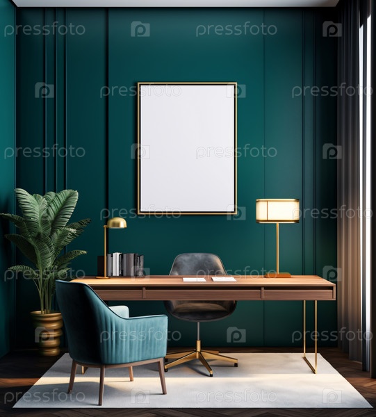 Минималистичный и комфортный интерьер домашнего рабочего пространства с деревянной мебелью, местом для копирования для монтажа на деревянном столе и пустой рамкой на белой стене