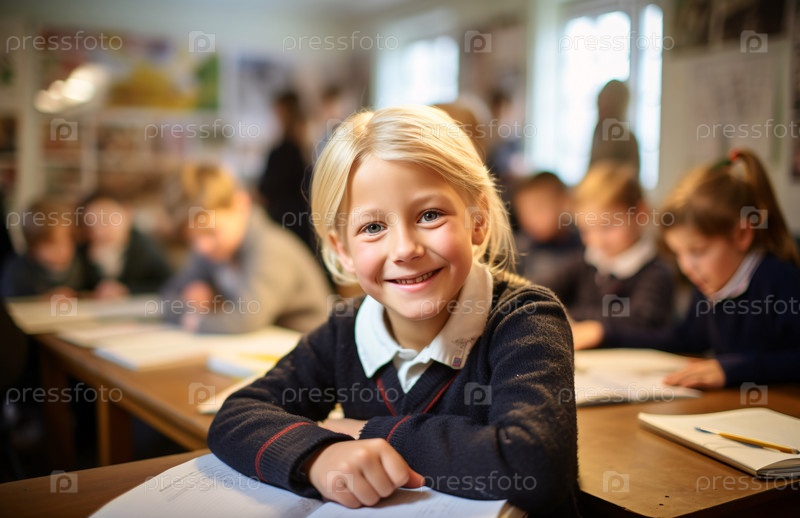Веселый ребенок улыбается, сидя за партой в оживленном, красочном классе, заполненном другими учениками